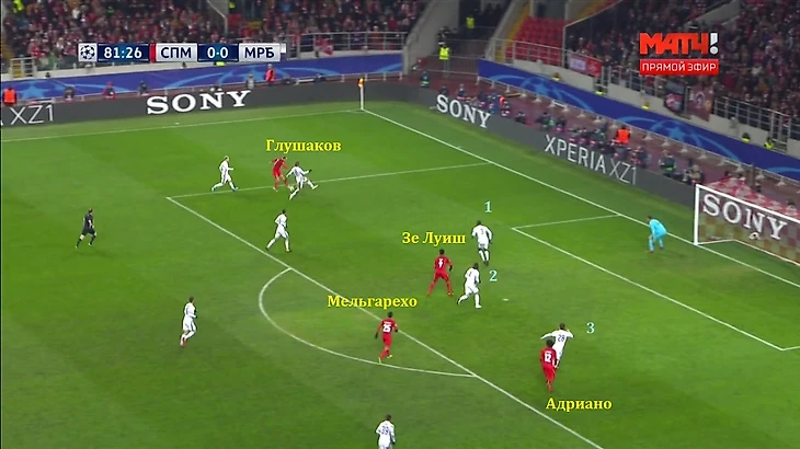 В итоге «Спартак» получил численное равенство в штрафной. Зе Луиш, Адриано и Мельгарехо коротко разыграли мяч между собой с небольшим рикошетом, и Зе поразил ворота Ясмина Хандановича.