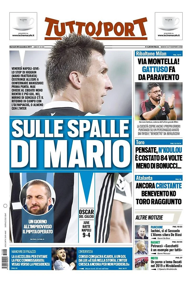 В пятницу «Наполи»-«Юве»: отсутствие Игуаина (сломана рука) подталкивает Аллегри к подтверждению Манджукича в качестве центрального нападающего. Макс просит у хорвата меньше смещений и больше голов. В планах Гонсало стоит возвращение на поле с «Олимпиакосом», или, по меньшей мере, с «Интером».