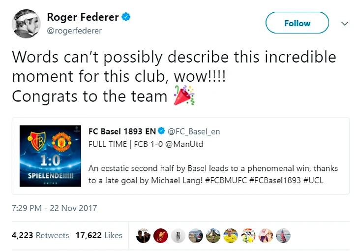 Теннисист из Швейцарии Роджер Федерер поздравил «Базель» с победой над «МЮ» в Лиге чемпионов. Федерер ретвитнул сообщение швейцарского клуба и написал: «Невозможно описать словами этот невероятный момент для клуба, вау! Поздравляю команду».