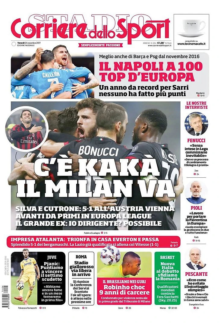 Лига Европы, итальянский триумф, 3 из 3 на стадии 1/16-финала. Гол, забитый венской «Аустрией» из-за грубой ошибки Бонуччи, вызвал реакцию: 5:1. Перед Кака сделали дубли Андре Силва и Кутроне: первое место и квалификация.