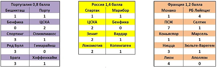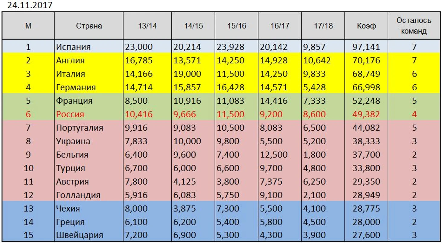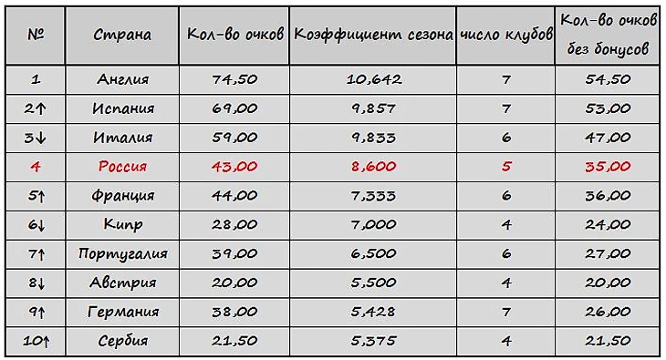 Занимающие пятую и седьмую строчки в таблице коэффициентов Франция и Португалия, нынешнюю еврокубковую неделю провели неплохо. Французы, даже набрали те же, что и у нас семь баллов, однако за счет того, что сумма делится на 6 клубов, их ассоциация приплюсовала к коэффициенту чуть меньше. Россия сумела на ещё один на маленький шажок приблизиться к пятерке, и на ещё один большой оторваться от седьмого места.
