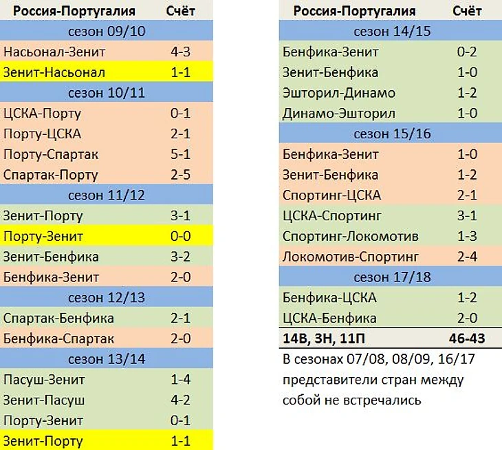 За последние 10 лет, титулов в еврокубках и у наших и у португальцев поровну – по одной победе в Лиге Европы. Между собой клубы встречались 28 раз побед больше у России. По забитым мячам также минимальное преимущество за отечественными командами. Причём если смотреть только пять последних сезонов преимущество России, только увеличится.