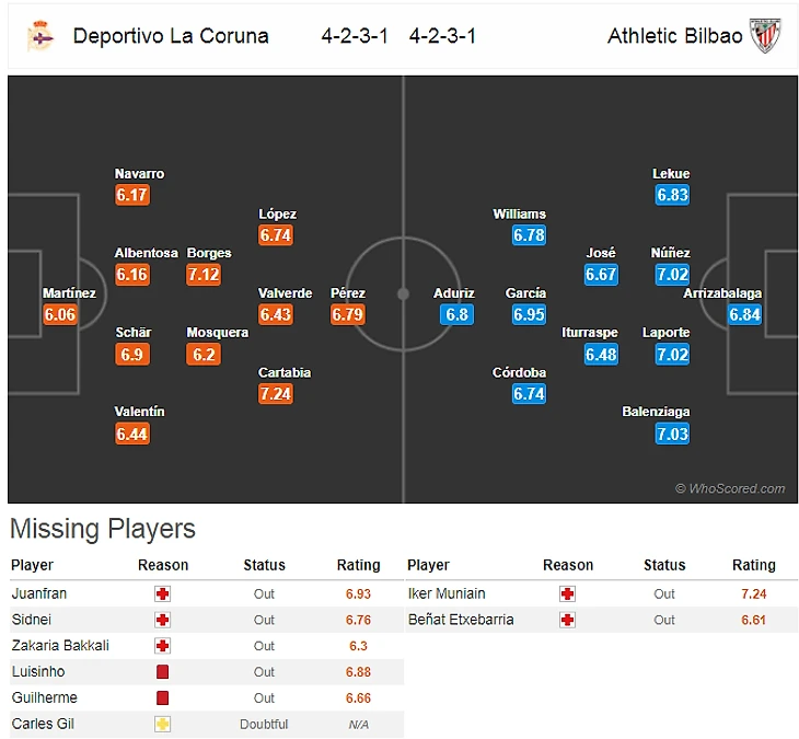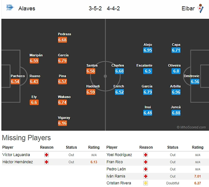 На что обратить внимание: На то что это хоть и маленькое, но гордое баскское дерби. Так что игра будет принципиальной и остросюжетной. К сожалению для хозяев в этой сече не сможет принять участие Виктор Лагуардия(5,5). На днях его выпустили из лазарета, но для того чтобы восстановить форму защитнику Алавеса понадобится около четырех недель.