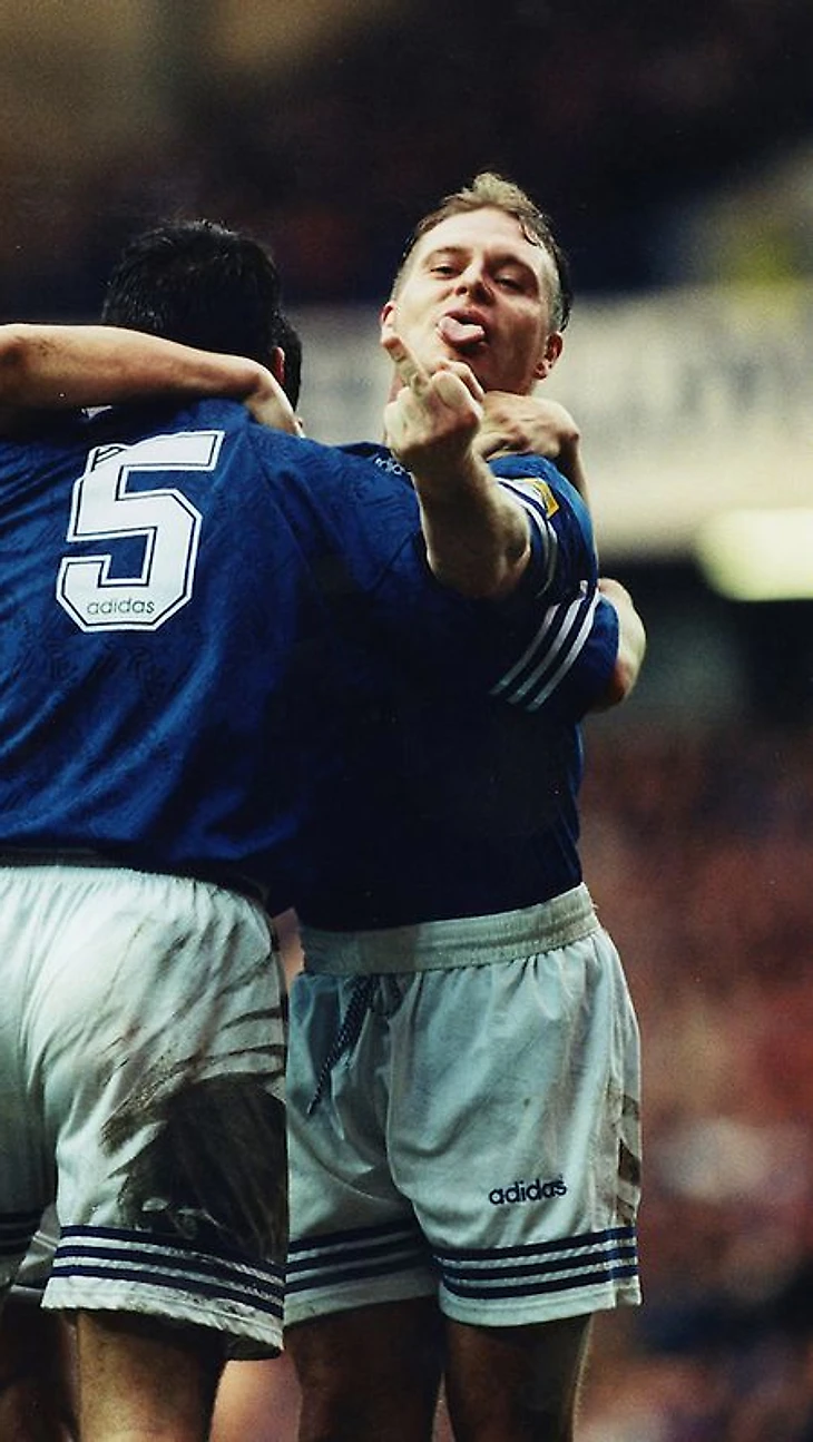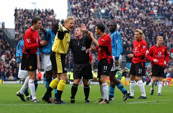 Петер Шмейхель в свитере «Ман Сити» скандалит с игроками бывшего клуба.