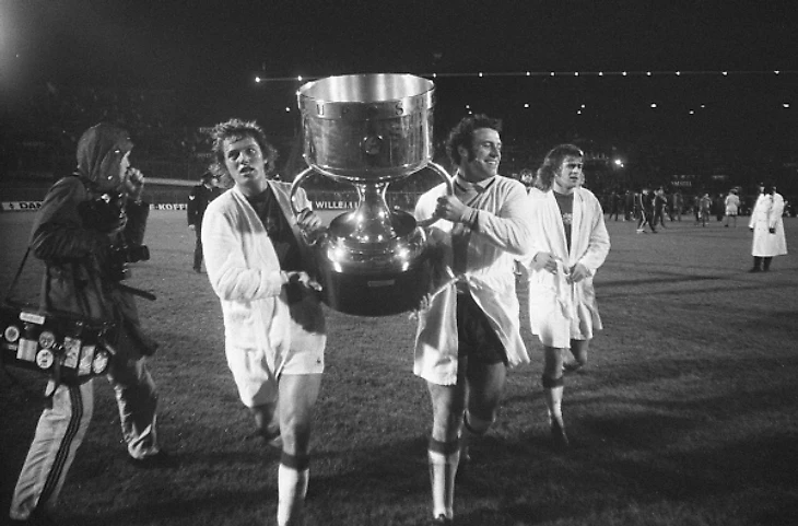 Прежний суперкубок Европы тяжело было нести даже вдвоем. Стараются – Джонни Реп и Хайнц Стей из «Аякса».