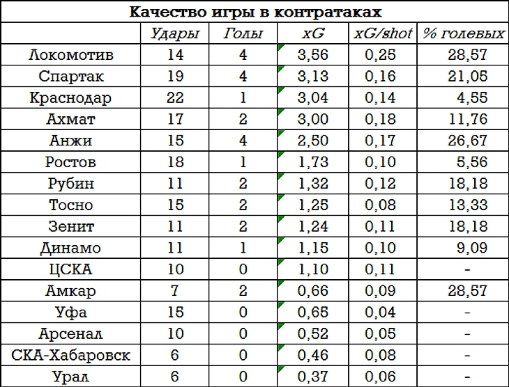 Со своей скоростной атакой «Спартак» – одна из лучших команд Премьер-Лиги по использованию скорости. В комплексе цифры красно-белых рисуют мощную картину, но по отдельности «Спартак» лучший в чемпионате лишь по количеству голов в быстрых атаках. Столько же забили хвалёный «Локомотив» и стоящий на вылет «Анжи» (внезапно). При этом «Спартак» – второй по количеству ударов в быстрых атаках, после «Краснодара», второй по созданному xG, после «Локо», и четвёртый по проценту голевых быстрых атак от общего числа. Продуктивнее используют скорость не только «железнодорожники», но и «Анжи» с «Амкаром». При этом «Спартак» создаёт хорошие средние шансы в быстрых атаках – если переводить xG-статистику на простой русский, можно ожидать гола в каждой шестой контратаке «Спартака» с ударом. Меньше жалости только у одной команды, опять же у «Локомотива».