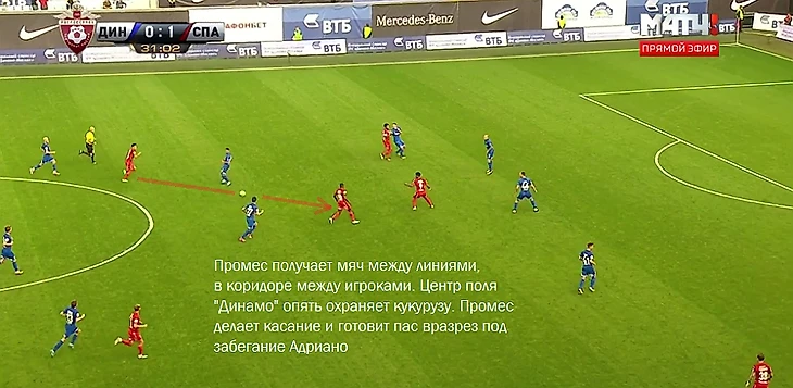 В результате Промес отдал передачу на партнёра, ускорился, нашёл свободную зону (благо что с тактической грамотностью «Динамо» их найти легко). И выдал пас вразрез на Адриано.