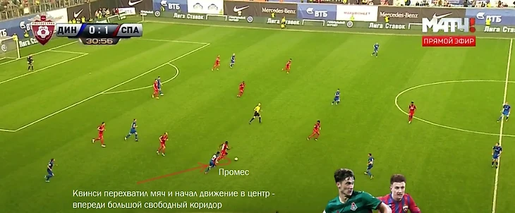 Иногда Квинси Промеса откровенно заносит психологически, особенно в больших матчах, и он пытается придумать атаку «Спартака» в одиночку. Но когда Промес в ментальном порядке, он полезен на любой стадии быстрой атаки. Так красно-белые забивали в летнем дерби «Динамо»: Промес сам опустился в глубину, перехватил передачу и разогнал атаку, рванув в пустеющую центральную зону. Легче миссию ему сделал Сапета, ушедший страховать на фланг крайнего защитника.