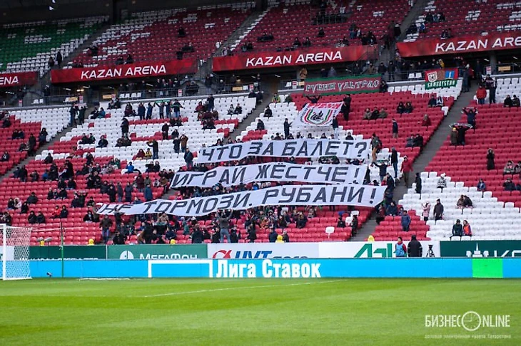 Говорить о том, что фанатов гостей на стадионе больше, чем хозяйских, наверное не стоит. На гранды на Казань Арене хоть и собирается народу больше чем обычно, но эту разницу как раз делают фанаты гостей, которых много не только на фанатской, но и на центральных трибунах. Так происходит уже года 3, и если эта тенденция продолжится, то Казань скоро будет смотреть либо на абсолютно пустые трибуны в матче с условным «Амкаром», либо на домашний матч в гостях в матчах с ЦСКА и «Зенитом». Но нельзя не отметить, что фанаты красно-зелёных стараются. Классным слоганом отметилась сегодня фанатская трибуна. А сектор на восточной трибуне сделал очень правильную вещь, вывесив баннер в поддержку Цезаря Наваса, который неделе потерял отца