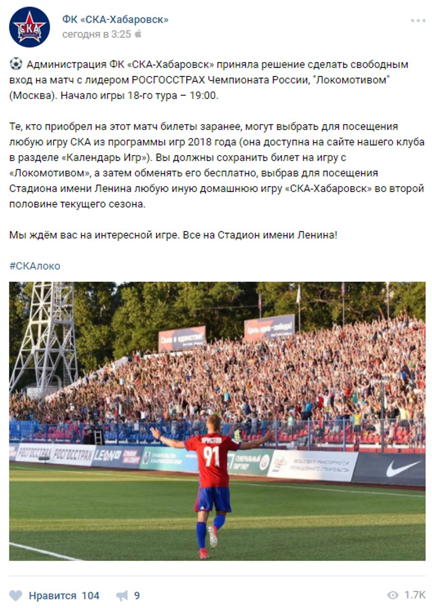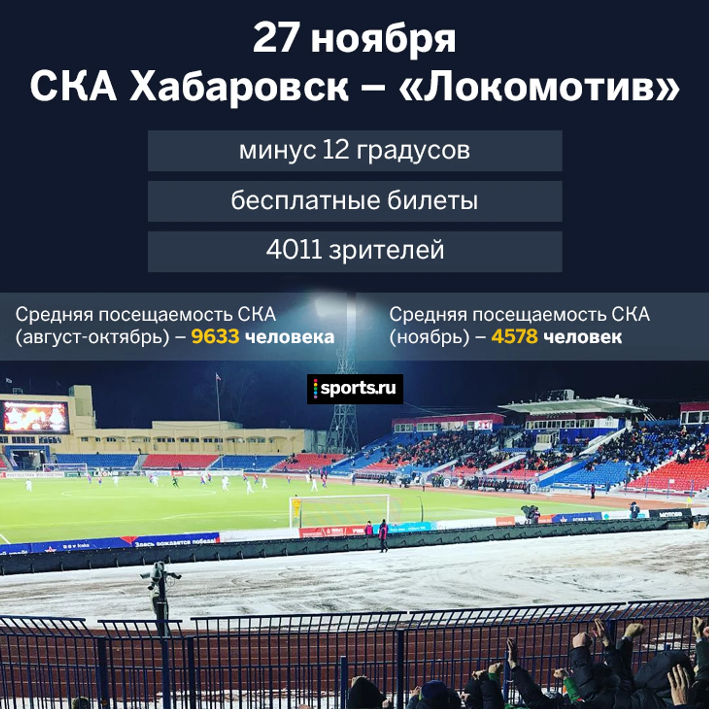 Матч «Локомотива» и СКА так никуда и не перенесли – и в понедельник команды сыграли в Хабаровске при минус 11. Матч получился достойным, с яркой развязкой, поле было почти зеленым, но увидели все это вживую только 4 тысячи человек. Даже при том, что за 12 часов до матча билеты сделали бесплатными.