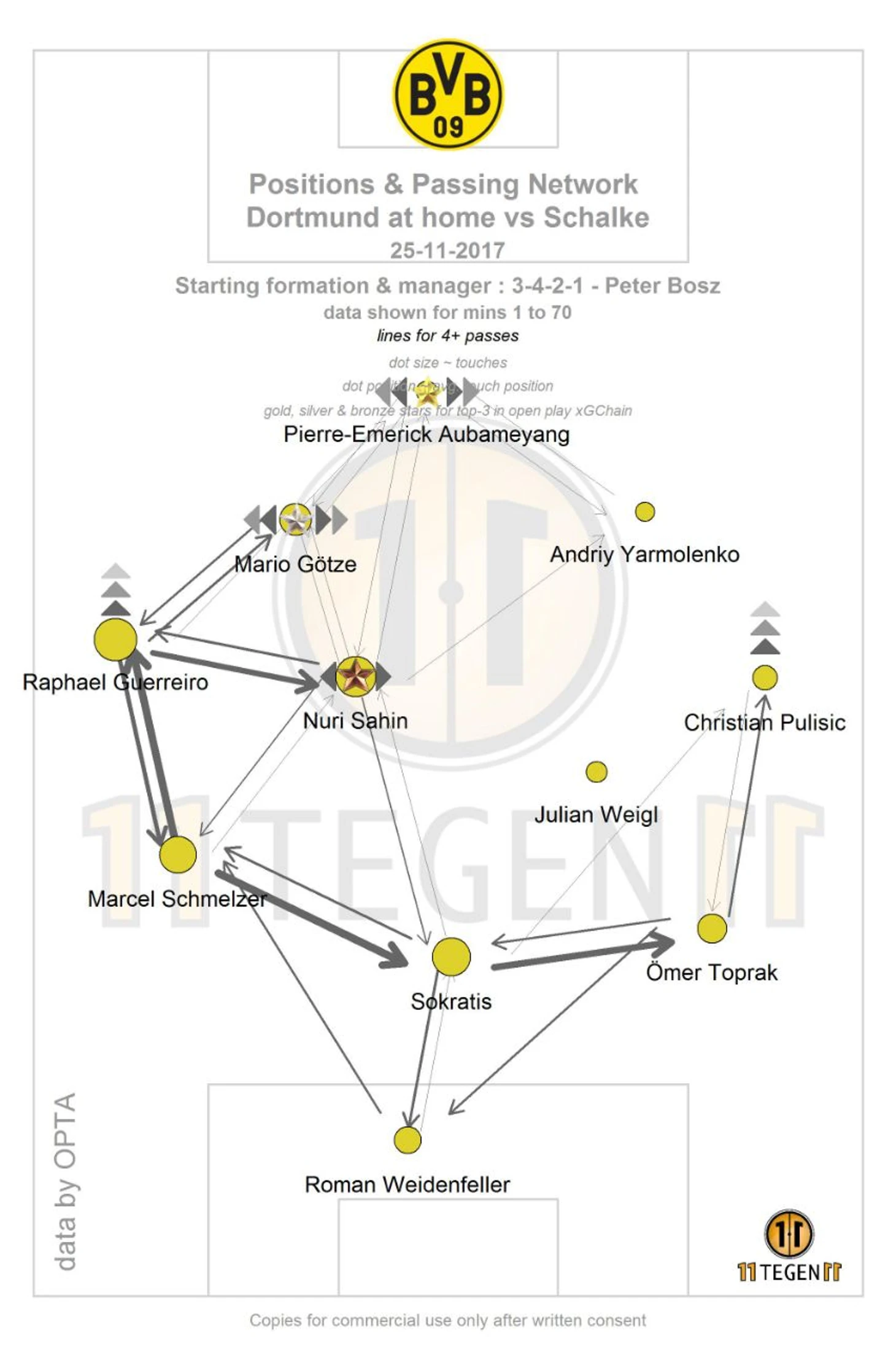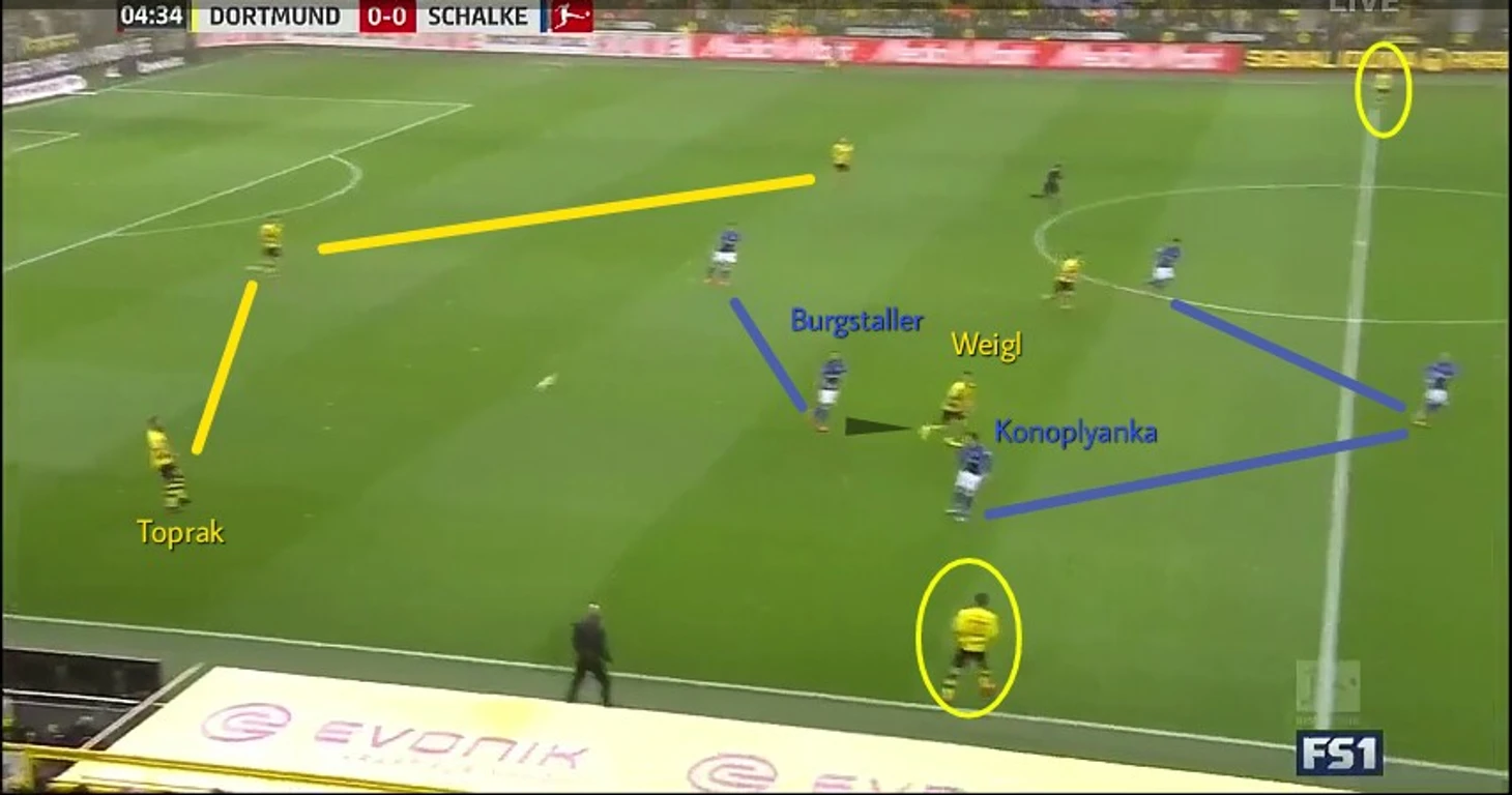 Основной задачей было закрыть Вайгля и не позволить ему получать мяч, что довольно эффективно работало: Бургшталлер и Коноплянка всегда были скоординированы между собой в прессинге, тем самым заставив "Боруссию" играть в основном через левый фланг.