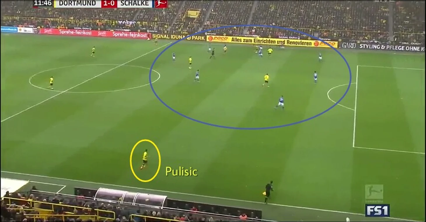 "Шальке" начал игру с проблемами на правом фланге, так как Калиджури, Маккенни и Стамбули проигрывали индивидуальные единоборства. Наблюдаемое стремление гостей закрыть лишь зону, где находится мяч, провалилась в случае с первым голом "Боруссии", когда Кристиан Пулишич получил мяч на свободном пространстве.