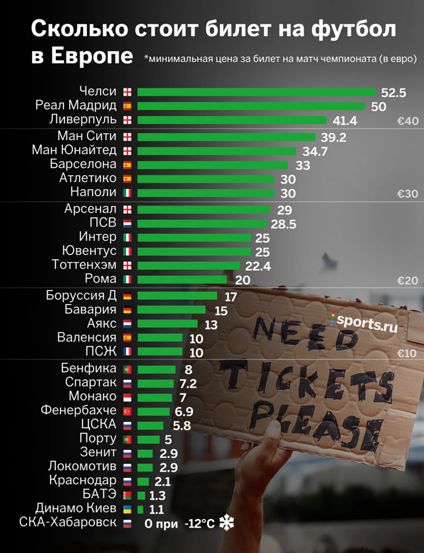 В ноябре ВВС опубликовал результаты ежегодного исследования Price of Football – о том, сколько стоят билеты и абонементы на футбол во всех английских и некоторых европейских лигах. Мы добавили данные о ценах на матчи главных российских и недостающих европейских клубов. Вот сколько денег вам понабится, чтобы купить самый дешевый билет на лучшие клубы Европы: