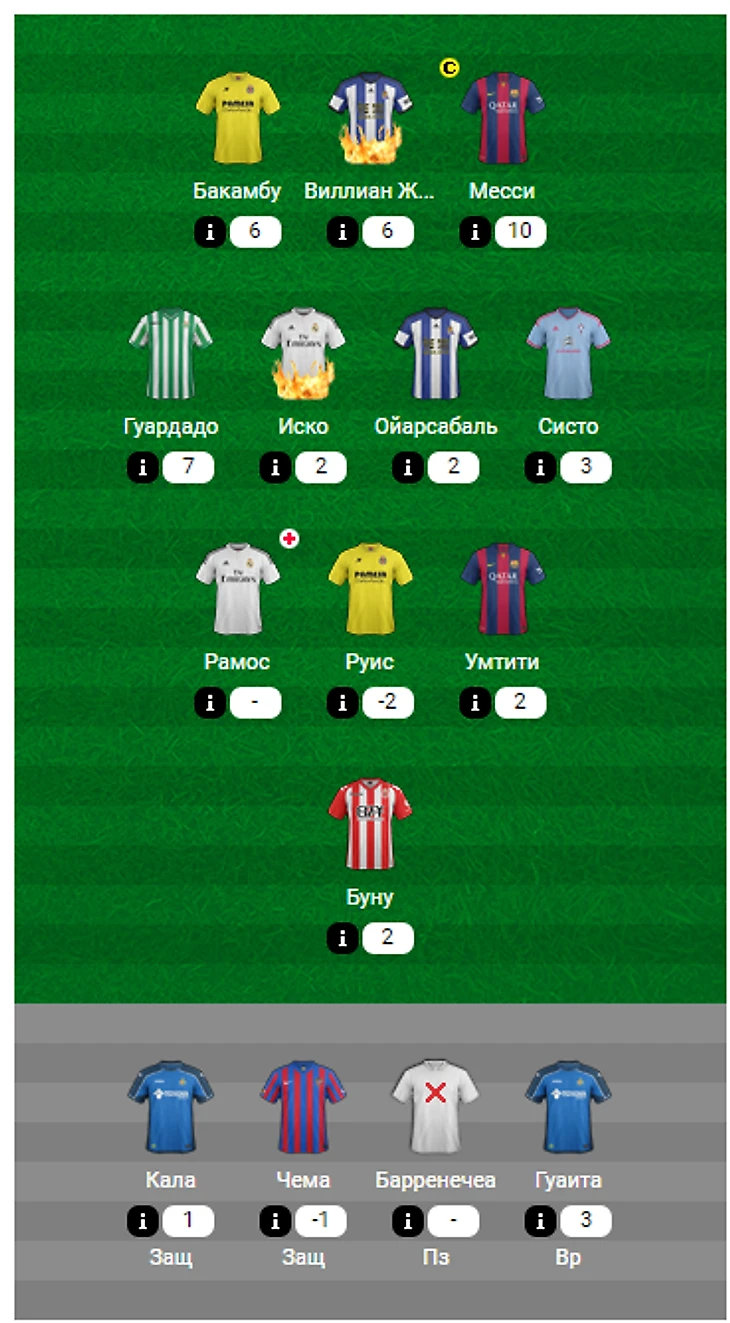 Попробуем сыграть дальновидно и занычить Ойарсабаля под следующий тур. Для этого придется покурочить полузащиту, изгнав из нее травмированного Гедеша и неактуального в этом туре Систо. Взамен получаем валенсийского Перейру и севильского Сарабиюа.