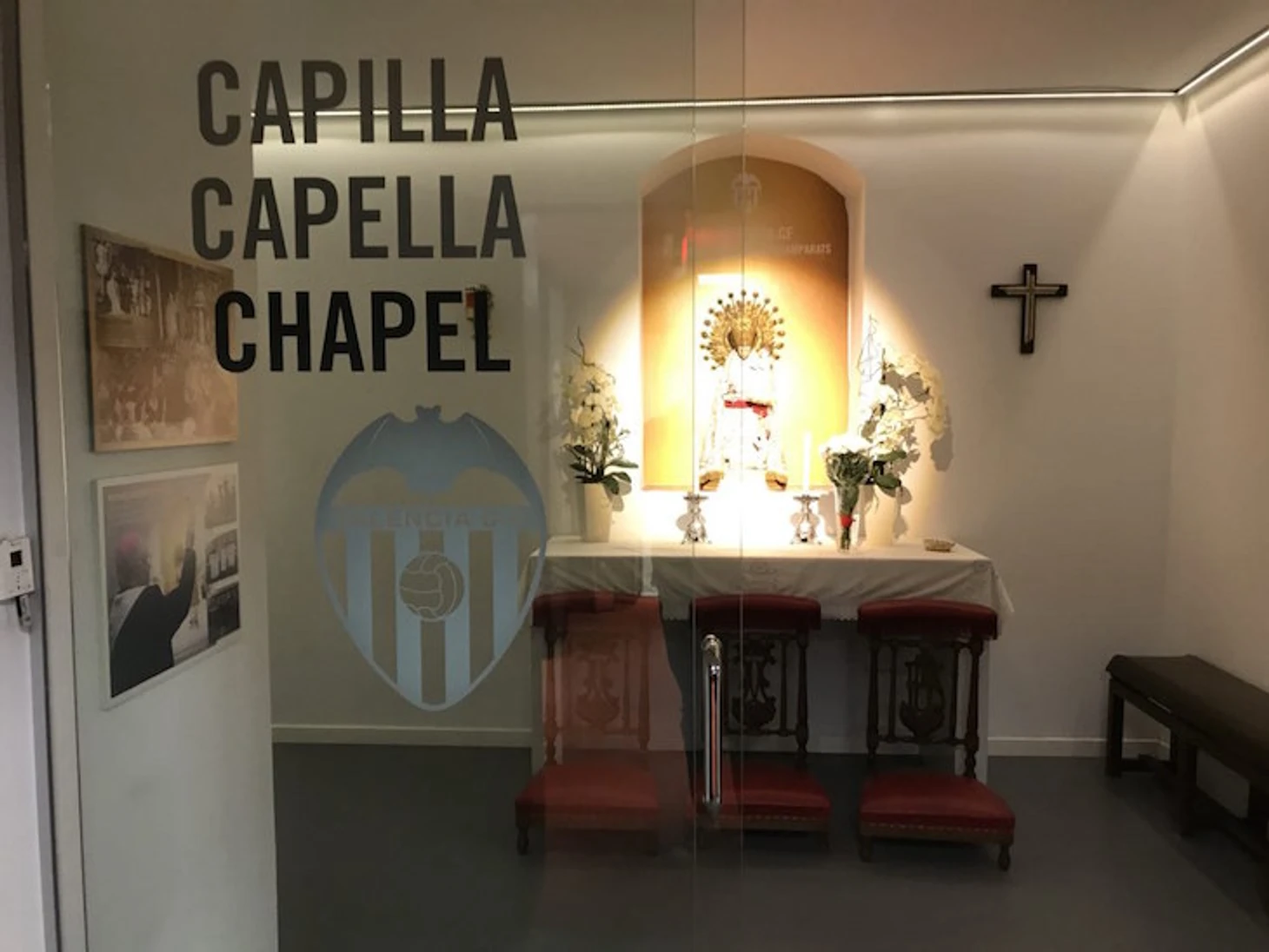 Самое эксклюзивное начинается в раздевалке. Проектор и экран сохранились со времен фанатеющего от видеоразборов Унаи Эмери – говорят, после его ухода в «Спартак» ими больше не пользовались. В соседнем отсеке находится судейская (при входе висят фотографии всех актуальных испанских арбитров) и маленькая комната для молитв – капелла. Там горят свечи, стоят цветы, есть мягкие подушки под колени – «Это исторический остаток прошлого, игроки давно сюда не заходят».