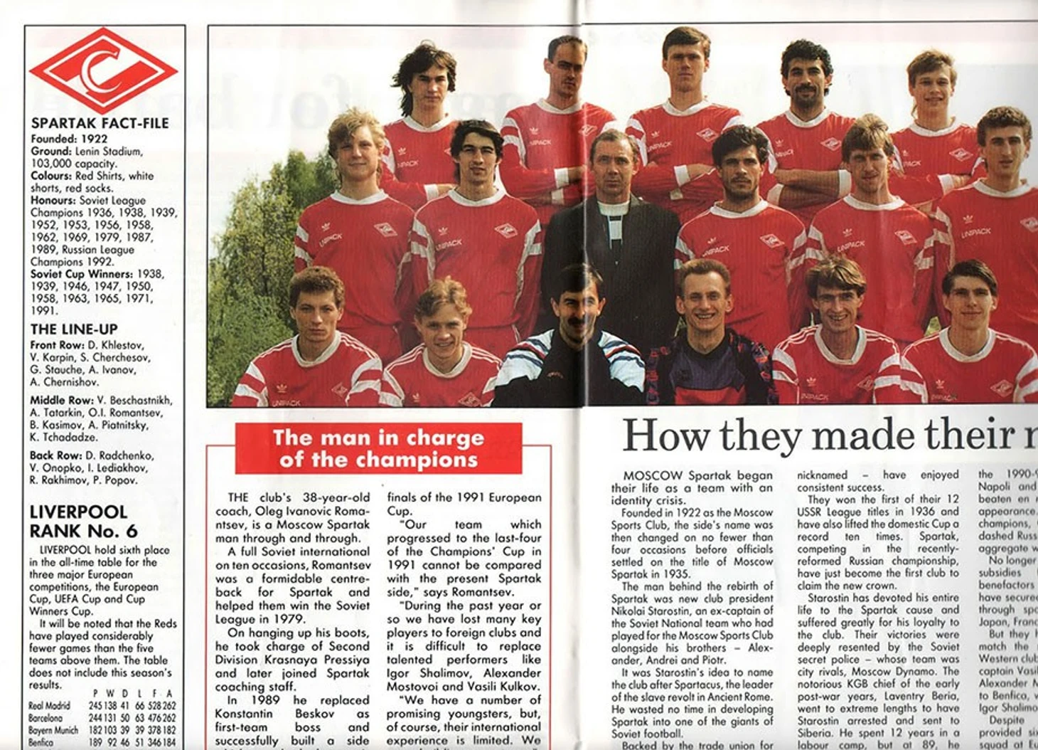 У нас была отличная команда с великолепным тренером, которая была готова. Ехали на «Энфилд» с запасом в два мяча и задачей выстоять. Матч был непростой, но меня игра захватила с первых же минут, да и соперник не позволял расслабляться. Помню, как Дима Хлёстов из пустых ворот вынес мяч: удар был в дальний угол, я бы уже не смог выбить мяч, а он выручил. Так что эта победа – командный успех. Можно сказать, что она одна из самых важных в истории «Спартака». А то, что про меня писали в программке, — журналисты всегда любят приукрасить!