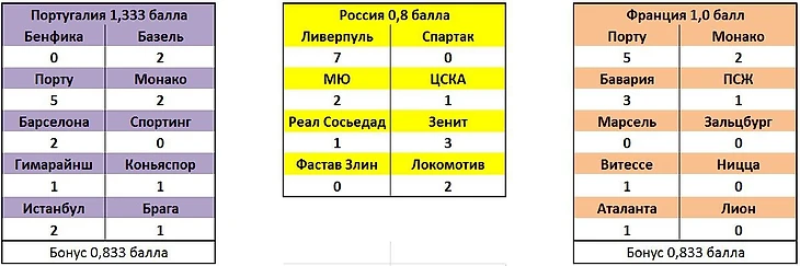 Франция в последнем туре провалилась, единственным клубом набравшим очки стал «Марсель», по итогам недели - одна ничья на шестерых. Эх, если бы не «ПСЖ» давно бы уже боролись с Францией за пятерку. Расположившиеся двумя строчками ниже португальцы действовали на одну победу лучше французов, добытчиками стали вышедший в 1/8 ЛЧ «Порту» и вылетевший из ЛЕ «Гимарайнш» - три очка на шестерых.