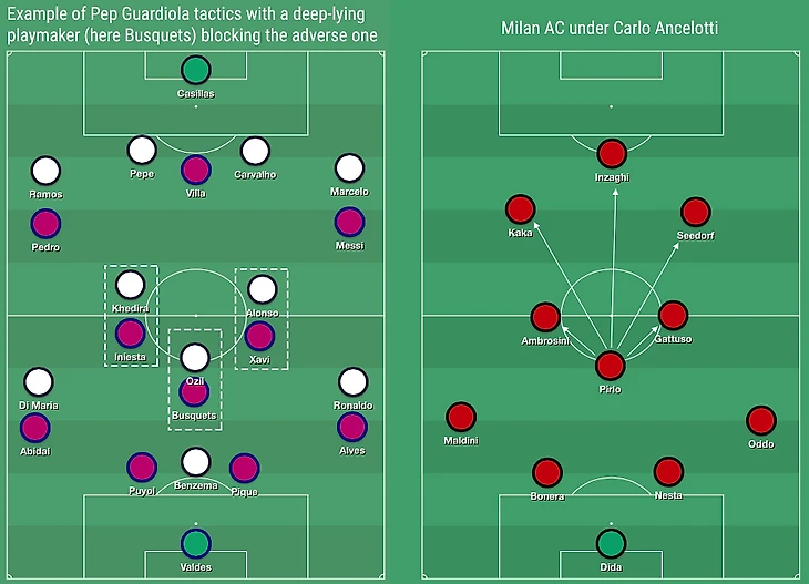 Другой пример: Пеп Гвардиола полностью изменил футбольное мышление Европы с его 4-3-3, со временем эволюционировавшем в 3-4-3. Помимо его понимания и воплощения идей Йохана Кройффа в виде тотального владения мячом, прессинга и постоянных перемещений игроков, он один из единственных, кто отказался от роли классической "десятки". Гвардиола опустил его глубже для дирижирования игрой команды и нейтрализации плеймейкера соперника. Карло Анчелотти с его "Миланом" в 2007 году - один из первых, кто действовал подобным образом с Андреа Пирло. Далее он практиковал такой футбол в "ПСЖ" с Тьяго Моттой и иногда даже с Марко Верратти на этой позиции.