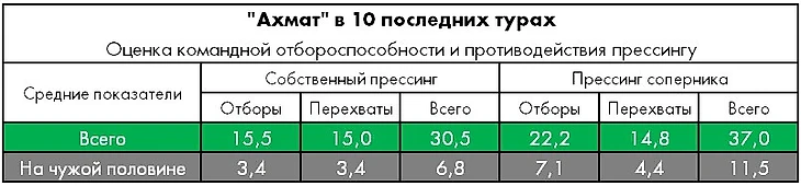 Еще одной проблемой «Ахмата» является не слишком уверенный выход из-под прессинга и ошибки в передачах на своей половине поля, что оборачивается ответными скоростными выпадами с критическими последствиями (5 пропущенных мячей непосредственно после отборов и перехватов соперника в 10 последних матчах).