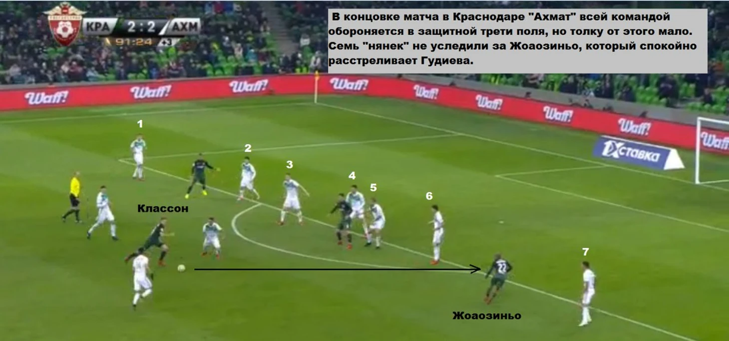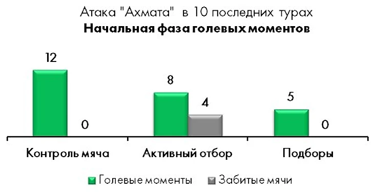 Стоит отметить, что проблемы «Ахмата» с реализацией не касаются эпизодов с переходом владения – все 4 результативные атаки «с игры» грозненцы провели непосредственно после отборов и перехватов на разных участках поля, пока соперник не успевал полностью перестроиться на позиционную оборону.