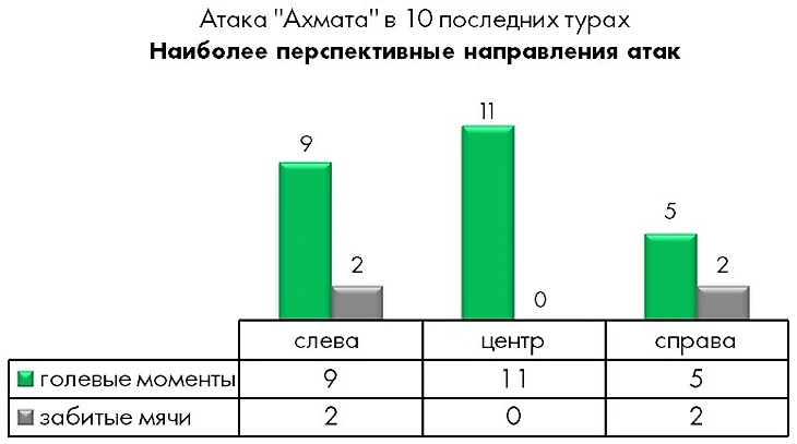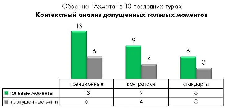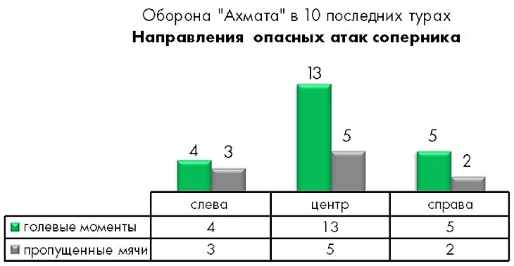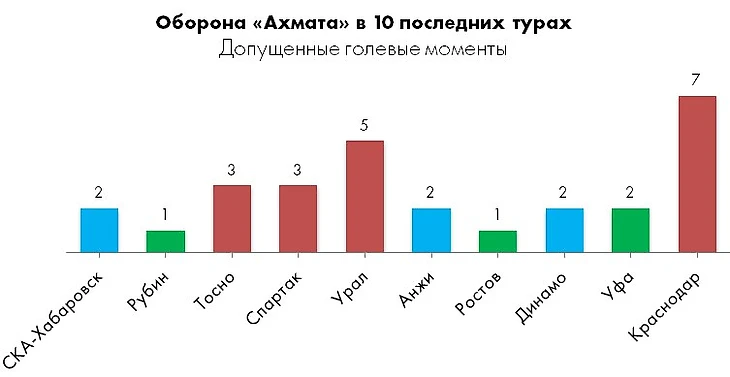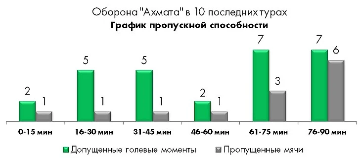 В оборонительном плане грозненцы во второй трети чемпионата выглядят очень неплохо, если вынести за скобки провальный второй тайм игры с «Краснодаром» (6 допущенных моментов/3 гола). По средней «норме допуска» голевых моментов у своих ворот (2,8 в среднем за игру) «Ахмат» гораздо ближе к лидерам чемпионата, чем к командам из нижней части турнирной таблицы.