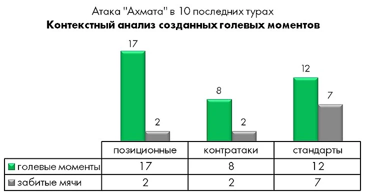 Другой вопрос, что на качество атакующих действий это не слишком влияет, и созидательная активность «Ахмата» во второй трети чемпионата невысока (3,7 голевых моментов и 1,1 гола в среднем за игру).