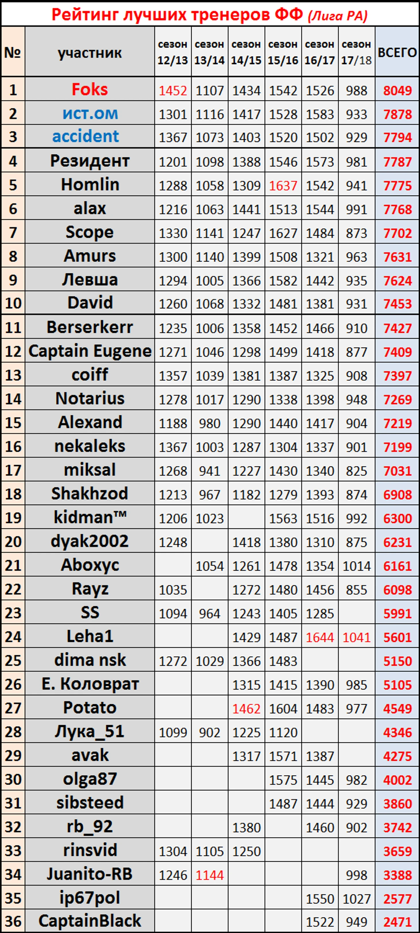 В заключении обзора, вашему вниманию предоставляю текущую таблицу лучших тренеров Лиги РА всех времен и народов (всех сезонов)... 36 лучших!