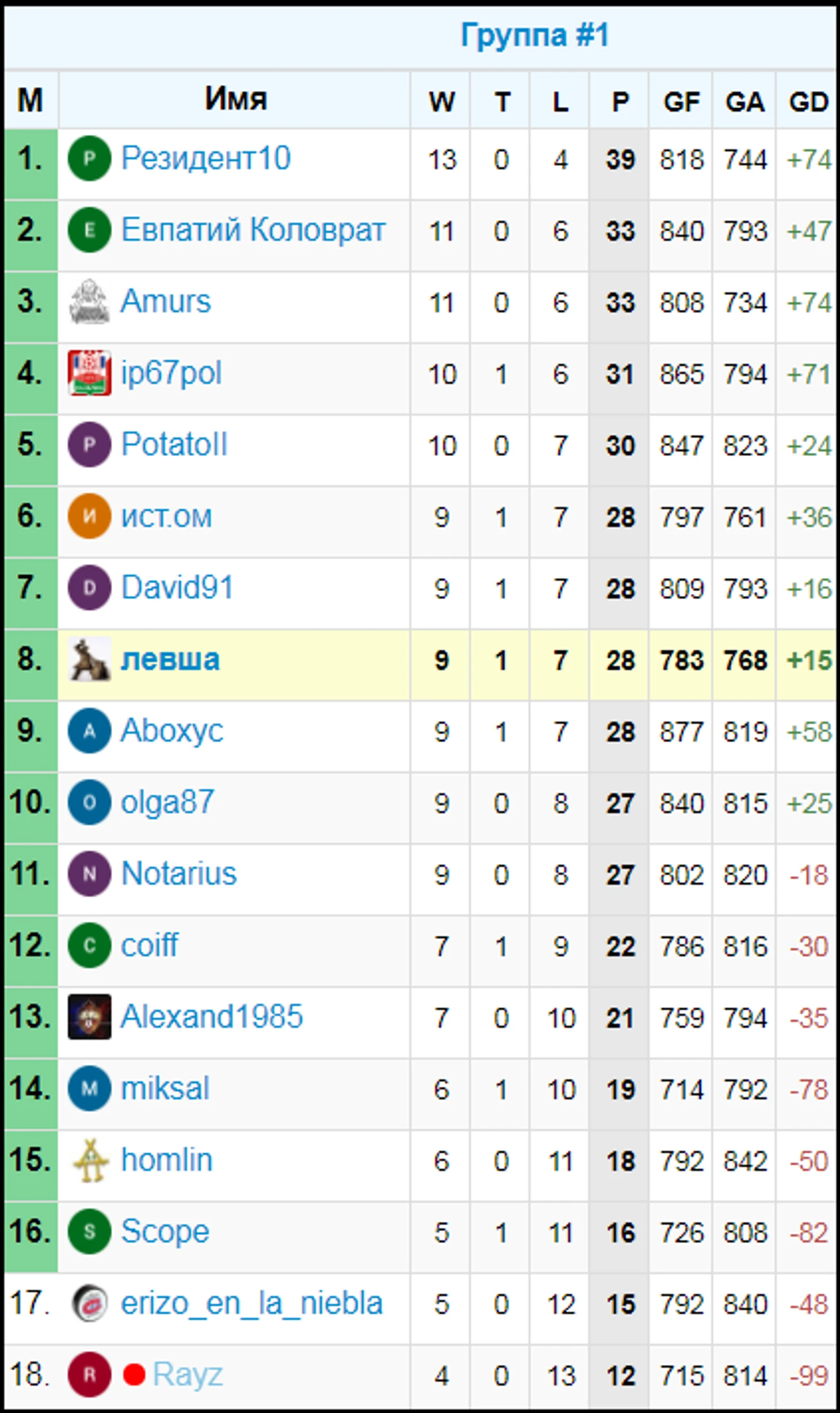 Чемпион прошлого сезона Алексей Leha1 и в этом сезоне долго удерживал свою команду на вершине таблицы, но на финише года видно сказалась эмоциональная усталость игроков и они уступили текущее первое место... Грамотный турнирный боец Александр ip67pol то же в претендентах на самые высокие места, его команда закончила этап на 3 месте и явно по потециалу способна на большее...