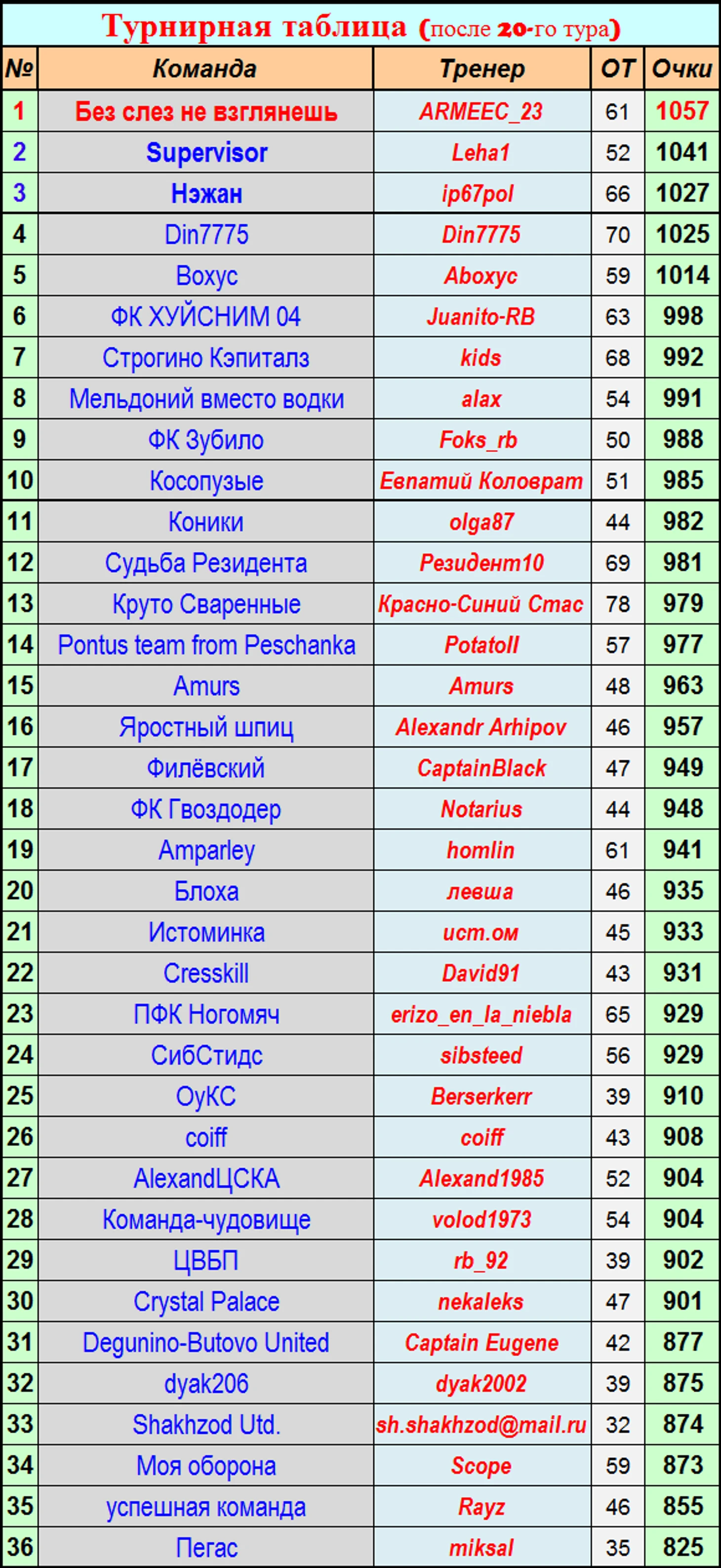 Отмечу еще 2-х тренеров, чьи команды в этом сезоне после 20 туров уже превысили черту в 1000 очков... Это еще один новый тренер нашей Лиги Алексей Din7775, который с первого же сезона сумел выстроить грамотную и амбициозную команду, играющую в довольно эффективный футбол... А так же это ветеран нашей тренерской когорты Андрей Aboxyc... команда его в этом сезоне явно поймала свою игру и очень реально, что его коллектив вполне способен в этом сезоне забраться на рекордно высокое для себя место (лучший результат у его команды за прошлые сезоны - 15 место)