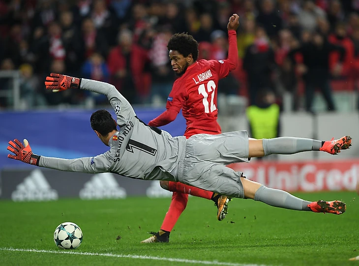 17 октября 2017 года. Москва. "Спартак" - "Севилья" - 5:1. Рекордная победа в Лиге чемпионов! Луиз АДРИАНУ забивает четвертый гол в ворота Серхио РИКО.