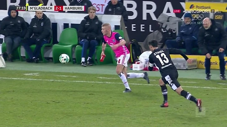 В матче чемпионата Германии возникла пауза. Защитник Рик ван Дронгелен потратил свободное время на то, чтобы попить воды. Когда игра возобновилась, футболист «Гамбурга» с бутылкой в руках повел мяч. А посторонние предметы на поле во время матча запрещены правилами.
