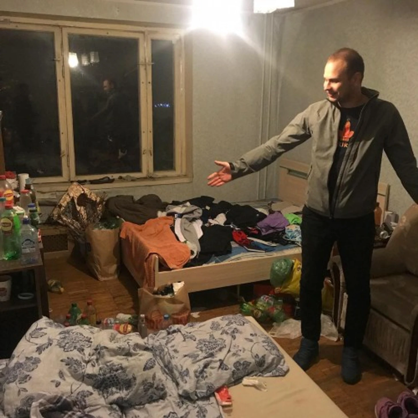 – Это где-то месяц я жил так. Куча вещей. Если присмотреться, там бутылки не от алкоголя – нет пивных или еще чего-то. Потому что я дома пиво один особо не пью. Я очень люблю вечером купить себе какой-нибудь водички, чаек – какой-нибудь липтон. И вот это все я выпил, поставил – оно копилось, копилось, я это аккуратненько двигал, переставлял, так все и образовалось.