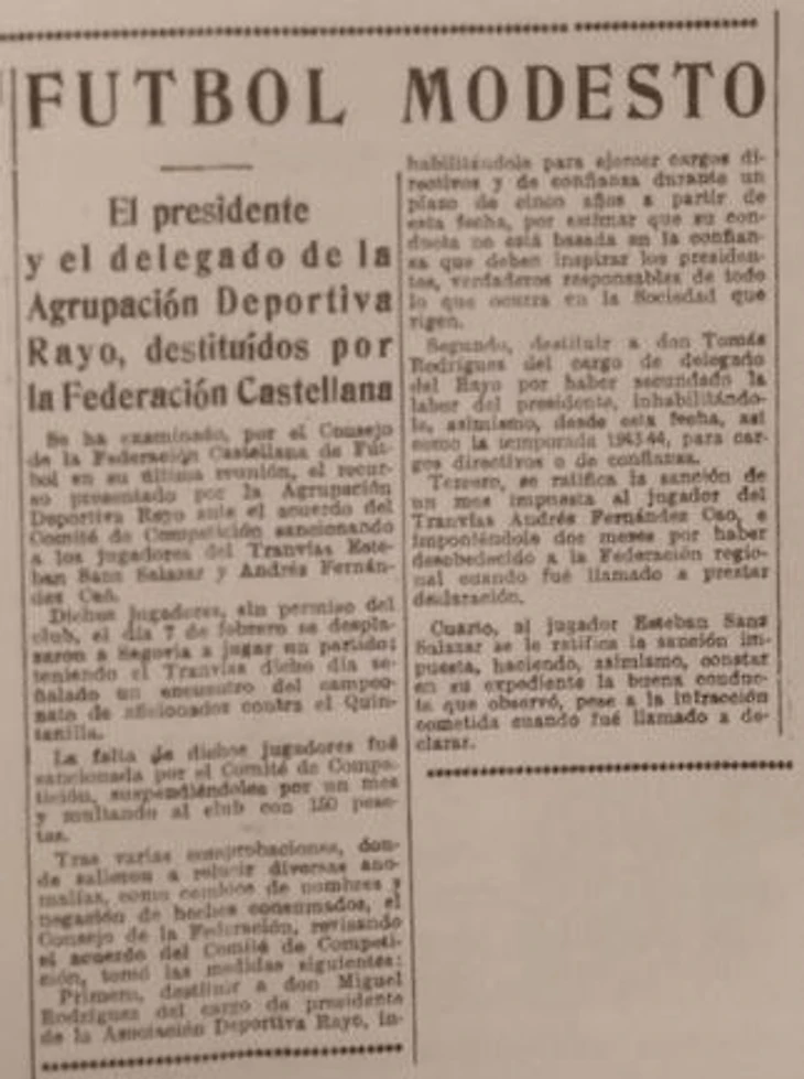 Весной 1943 года между Федерацией и Райо разгорелся серьезный конфликт. 1 апреля в газете Марка вышла статья со следующим заголовком: “Кастильская Федерация отстраняет президента и делегата Райо”. С похожим названием в заголовке 2 апреля вышла газета Гол. События, приведшие к отстранению, произошли 7 февраля. В этот день в составе Райо в матче в Сеговии вышло два игрока из команды Транвиас, которая в этот же день в рамках Чемпионата среди любителей играла против команды Куинтанилья. Комитет чемпионата узнал об этом и отстранил от игр этих двух игроков на месяц и оштрафовал Райо на 150 песет. Райо в ответ на это, с целью отмены вердикта, подал жалобу на это решение, где отрицал обвинения, ссылаясь на протокол матча и показания президента, делегата и игроков команды. Комитет приступил к расследованию. В основном благодаря показаниям одного из двух игроков Транвиас члены комитета пришли к выводу, что в составе Райо два игрока вышли на поле под фальшивыми именами. Как бы то ни было, санкции со стороны Федерации были чрезвычайно жесткими. Президент клуба Мигель Родригес Алсола был отстранён от должности и в течение пяти лет ему было запрещено занимать управляющие должности “за то, что его действия не основывались на принципе честности, которым должны следовать президенты, в полной мере отвечающие за все, что происходит в обществах, которыми они управляют”. Делегат клуба, а также фактически тренер (всё ещё без лицензии), Томас Родригес Рубио также был отстранен от должности и получил дисквалификацию на конец этого сезона и на следующий сезон целиком, так же с запретом занимать какие-либо управленческие должности “как сообщник действий президента”.