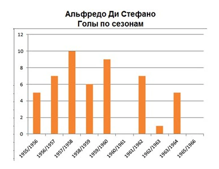 На следующей диаграмме показано соотношение количества голов Ди Стефано к общему количеству голов его клубов. Наиболее полезным он был в сезоне 1958/1959, когда забил семь голов из пятнадцати голов сливочных. Среднегодовой коэффициент полезности Ди Стефано – 26,042%.