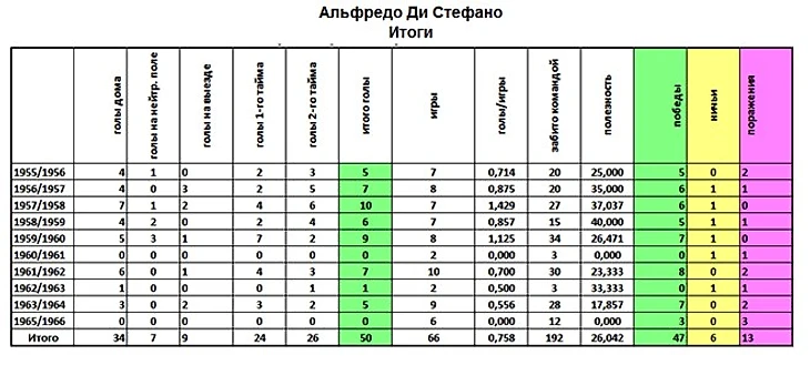 Голы Ди Стефано являлись крайне удачными для «Реала», что, впрочем и неудивительно для того времени! Из 66 проведённых матчей испанца «Реал» победил в 47 (71%), в шести сыграл вничью (9%) и ещё в 13 проиграл (около 20%).