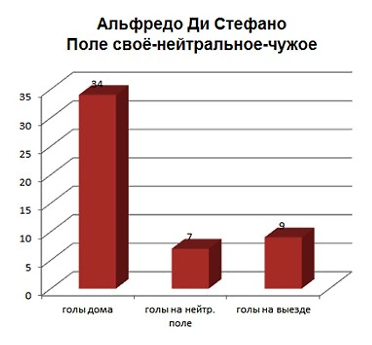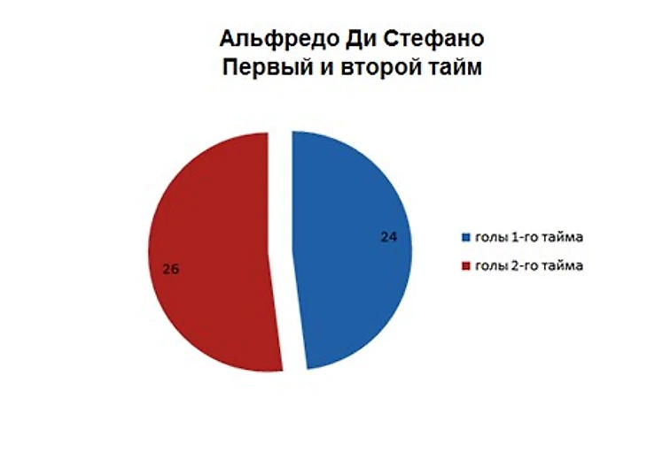 А вот в каком из таймов забивать – в первом или во втором, для Ди Стефано было совершенно не важно. 26 из своих голов (52%) он забил во вторых таймах, в первом тайме он забил 24 гола (48%).