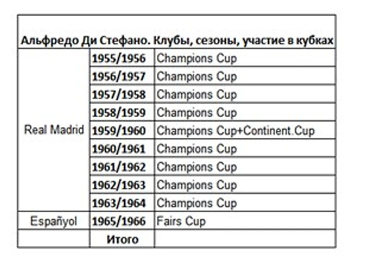 Общий же итог выступления Ди Стефано в еврокубках – 50 голов в 66 матчах и средняя результативность 0,758 гола за матч. Дома он забивал куда больше, чем на выезде – 34 домашних гола против девяти выездных, а кроме того было ещё семь голов в матчах на нейтральном поле.