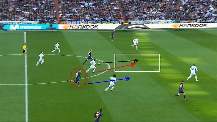 Ракитич бежит в открытую зону, Ковачич должен идти перекрывать соотечественника, но он идёт держать Месси, который бежит параллельно Ивану, зная, что Матео пойдёт его закрывать.