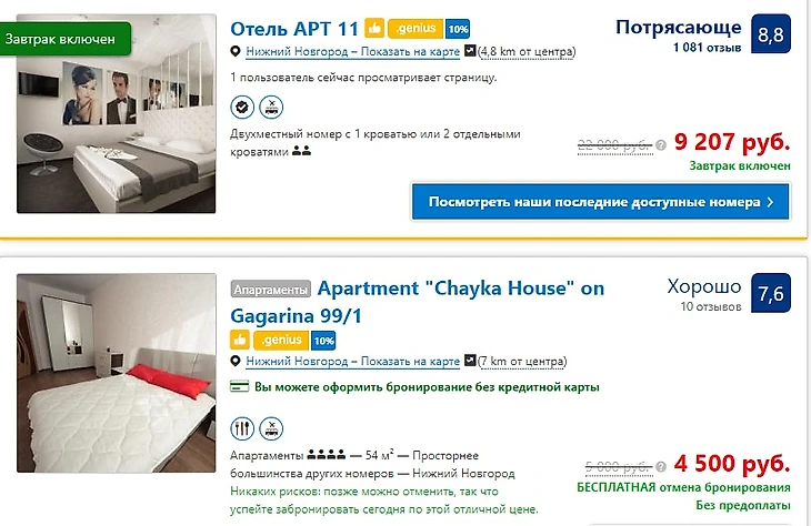 Я специально не смотрел день матча сборной России, чтобы понять хотя бы средние цены и типичные варианты. Тут есть и апартаменты, как в Саранске, и вполне бюджетные варианты, но их не так уж много.