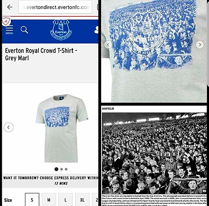 «Эвертон» начал продажу ретро-футболок с изображением болельщиков на груди. Все было хорошо до тех пор, пока внимательные пользователи не заметили ошибку. Оказалось, что на фотографии никакие не болельщики «Эвертона», а фанаты «Ливерпуля».