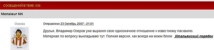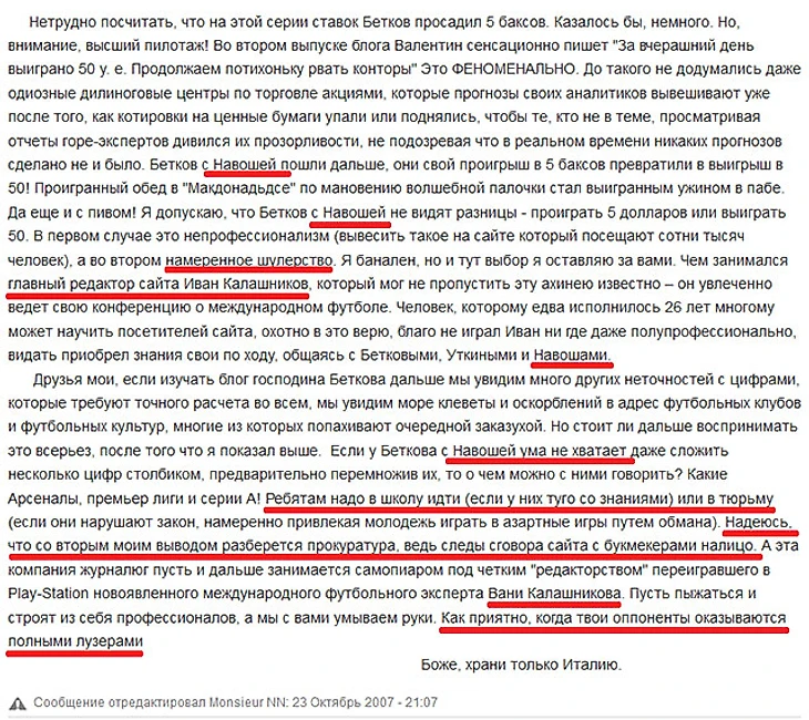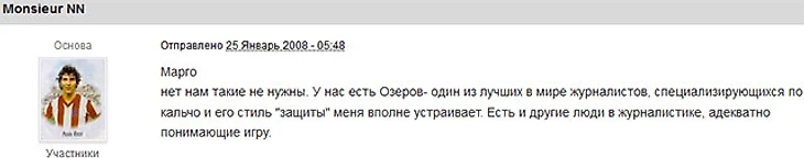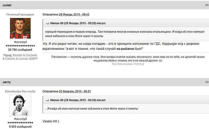 Про выпады Алексея в сети ходят легенды, опять же многие из которых погребены с рухнувшим казавлади. Однако стоит немного погуглить каменты Monsieur NN на миланфане, как становится очевидным, что с прежним никнеймом он сильно бы страдал от хейтеров всех мастей.