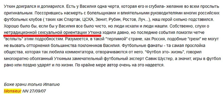 Впрочем, я немного отвлёкся... Так вот, статья, несмотря на то, что излагает многим и так известные факты (лично для себя я узнал немало любопытных деталей, но как известно, ценнее пруфов - только каминг-аут), на самом деле является прекрасным сборником цитат и параллелей, наглядно демонстрирующих истинное лицо популярного автора. Простота, искренность, душевная ясность и человеколюбие в около- и просто футбольном чтиве, как и в практически любом жанре бумагомарания килобитами текста - это не тот случай, к сожалению. И уже не отделаться от чувства стыда и брезгливости, возникшего после прочтения сей подборки, при любом упоминании Логинова/Малиновского/НН, не говоря о том, что крайне удивительно и неприемлемо будет видеть и так излишне щедрую благосклонность крупнейшего русскоязычного портала о спорте к столь противоречивому блогеру, статьи за подписью которого регулярно публикуются и читаются сотнями, если не тысячами пользователей разных национальностей, возрастов и социальных статусов.