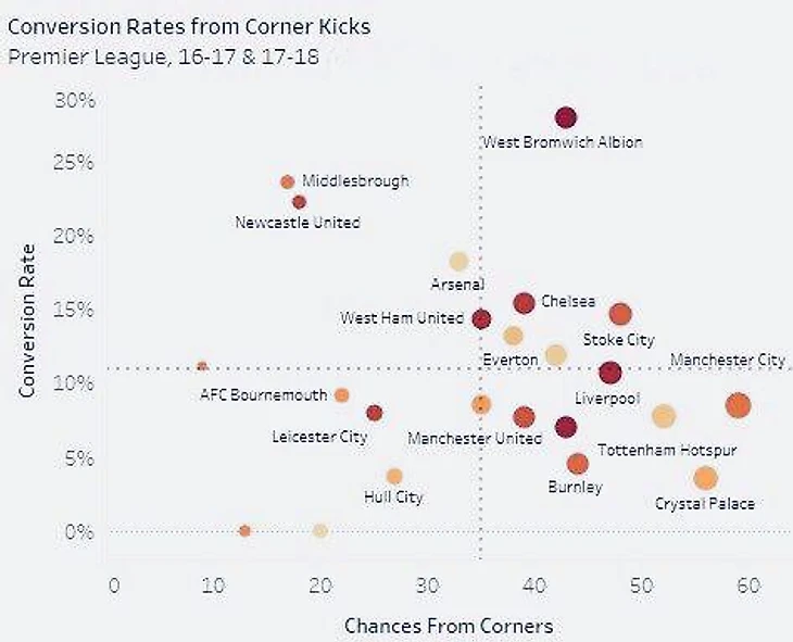 очевидно, что больше всего из стандартов должны выжимать команды, которые мало что могут создать с игры. и самым результативным становится «Вест Бромвич», который ещё при Тони Пьюлисе забил 12 голов при 43 ударах после угловых: 28% конверсии — лучший показатель лиги.