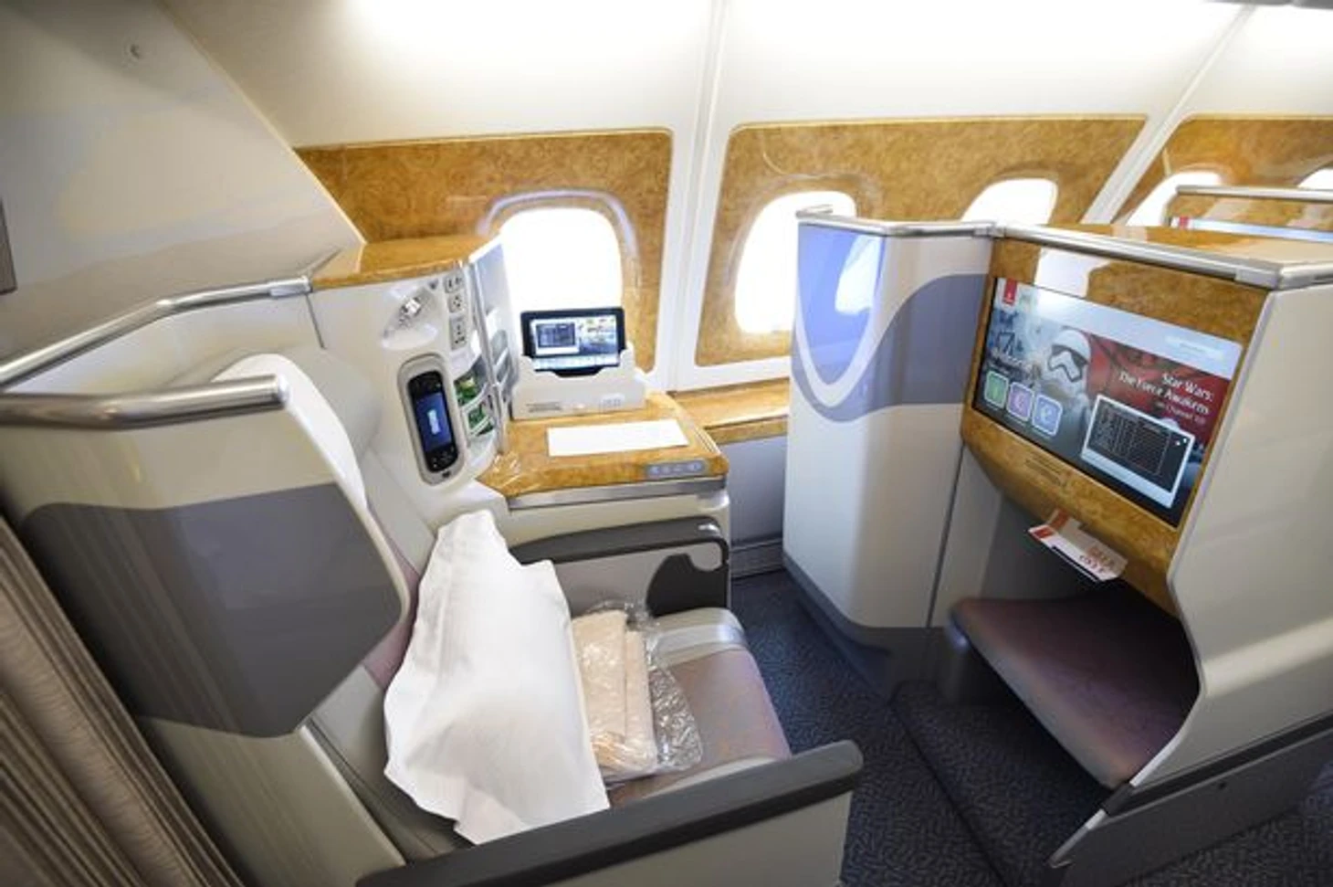 И завершает подборку от Emirates (но не нашу подборку про самолеты), конечно, «Реал Мадрид». Свеженький дизайн Airbus A380 был представлен в аэропорту столицы Испании в марте этого года. Все те же 500 кв.м. изображения пяти игроков - ВВС в центре + Серхио Рамос и Марсело по краям. Парни не только сделали селфи на фоне самих себя, но и заглянули в салон самолета.