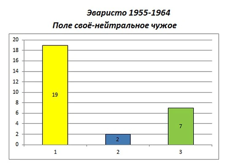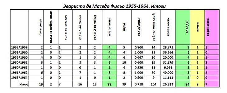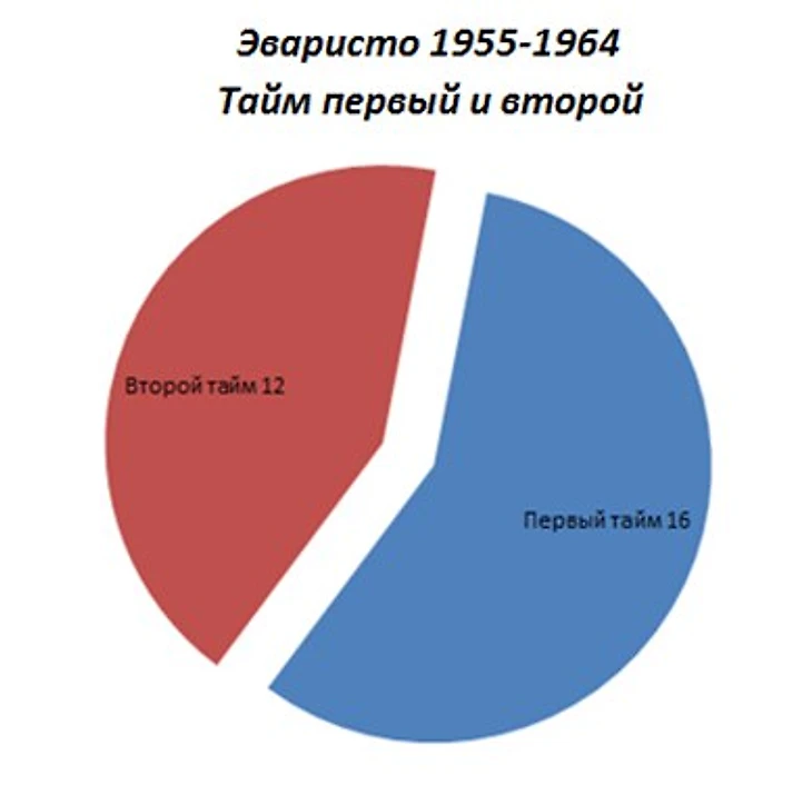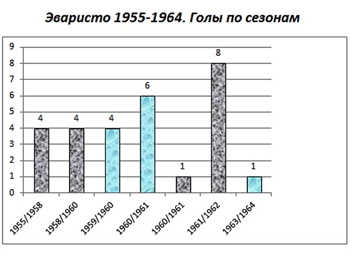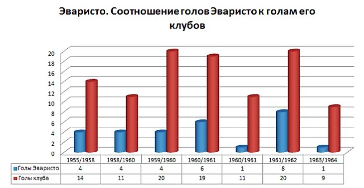 На следующей диаграмме показано соотношение количества голов Эваристо к общему количеству голов его клубов. Наиболее полезным он был в сезоне 1961/1962, когда забил восемь голов из двадцати голов «Барсы». Среднегодовой же коэффициент полезности Эваристо – 26,923%.