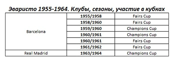 Главной голевой силой и стал бразилец Эваристо, пришедший в «Барсу» незадолго до начала первого розыгрыша кубка Ярмарок. В первом и втором розыгрыше кубка Эваристо забивал по четыре гола. С сезона 1959/1960 он умудрялся выступать и в Кубке чемпионов – в дебютном для себя сезоне он забил свои «дежурные» четыре гола, а вот в следующем сезоне отличился сразу шесть раз, забивая победны голы в полуфинальных матчах против Гамбурга.