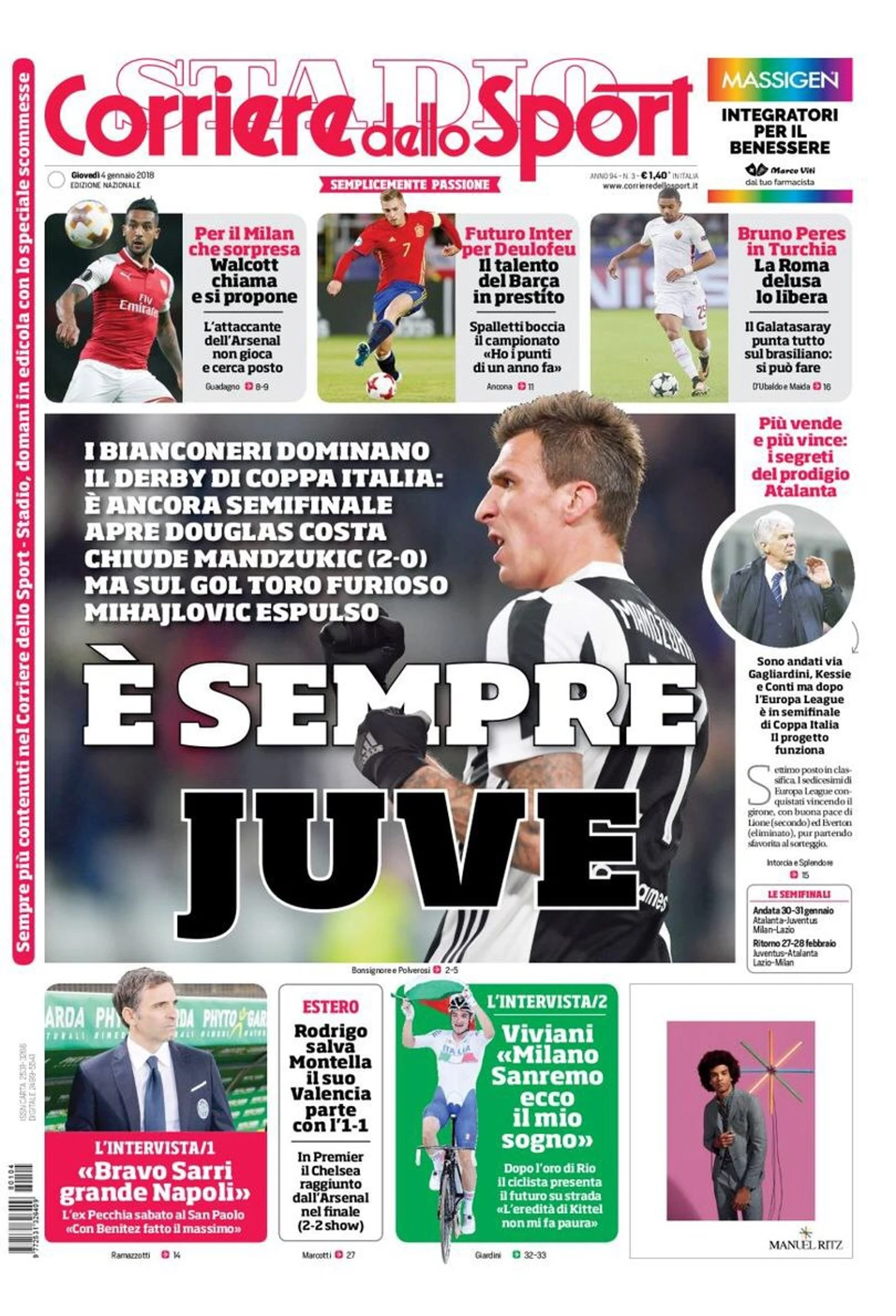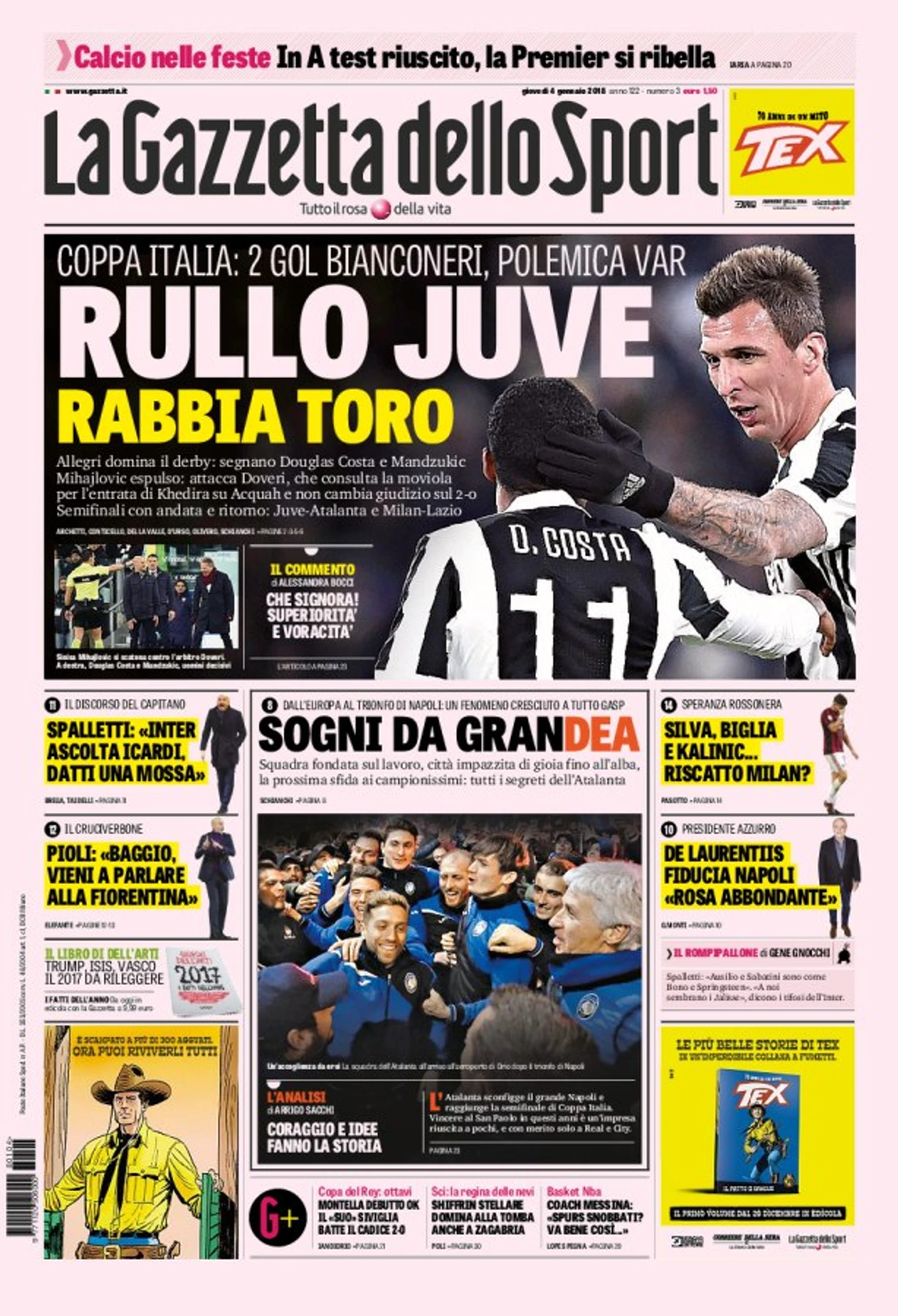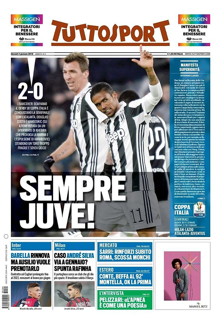 Кубок Италии: 2 гола Бьянконери, споры о видеоповторе. Аллегри доминировал: Дуглас Коста забил, Манджукич удвоил и разозлил Михайловича против Довери, который консультировался с видеоповтором насчёт действия Хедиры против Аскуа, но не поменял решения. Полуфиналы с первыми и ответными матчами: «Юве»-«Аталанта» и «Милан»-«Лацио».