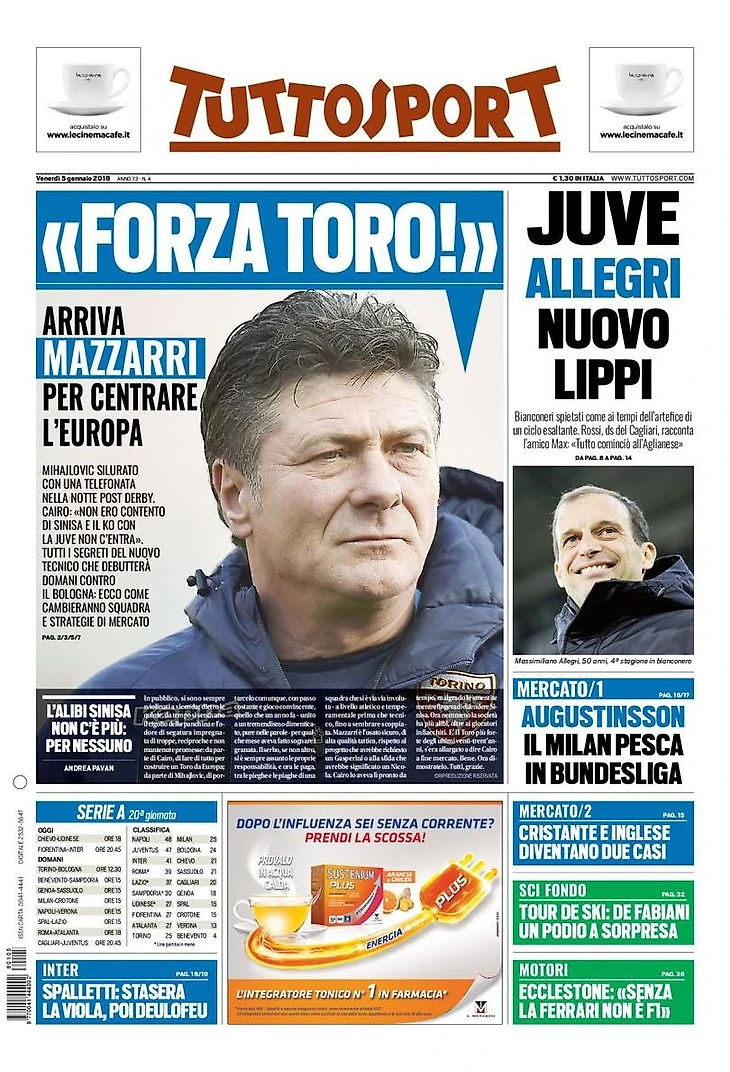 Приходит Мадзарри, чтобы попасть в Европу. Михайлович снят с должности телефонным звонком в ночь после дерби. Каиро: «Не был доволен Синишей и поражение от «Юве» тут не при чём». Все секреты нового тренера, который дебютирует завтра против «Болоньи»: вот как поменяется команда и рыночная стратегия.