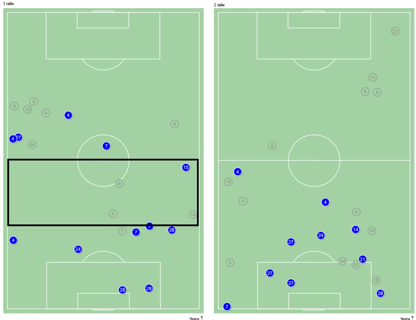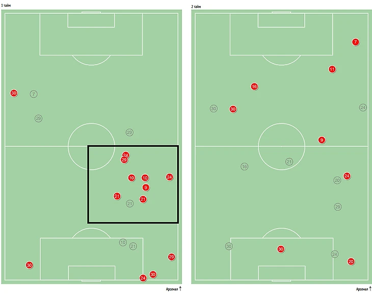 В остальном выгоду «Челси» от насыщения левой зоны получал на противоположном фланге. Смещение оборонительных линий «Арсенала» в сторону мяча приводили к ситуациям 1 в 1 в зоне Мозеса/Мэйтланд-Найлса, чем «Челси» часто пользовался, резко меняя направление атаки.