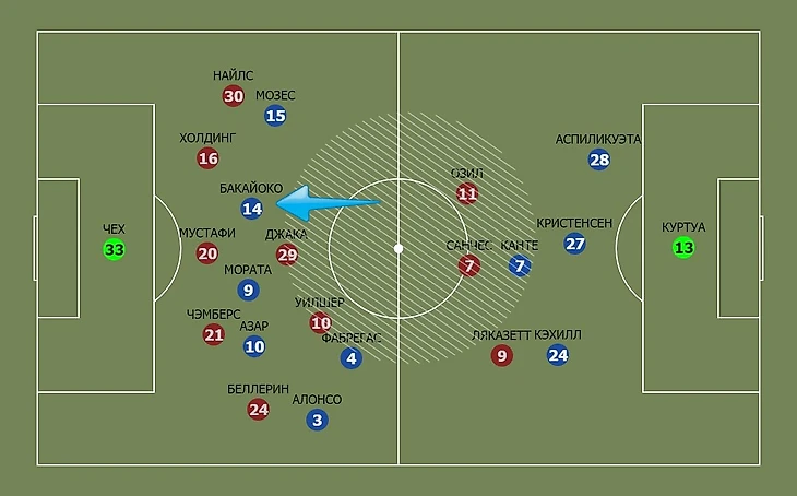 Его партнеры занимали широкие позиции относительно Бакайоко и Фабрегаса, что позволяло команде обходить среднюю линию противника и при подготовке выхода на завершении избегать столкновений с Канте. Таким образом, «Арсенал» сделал ставку на розыгрыш мяча через самые слабые оборонительные звенья в структуре полузащиты «Челси», фактически не имея сопротивления до проникновения в чужую треть. Показательны точки отборов «Челси», особенно до перерыва: